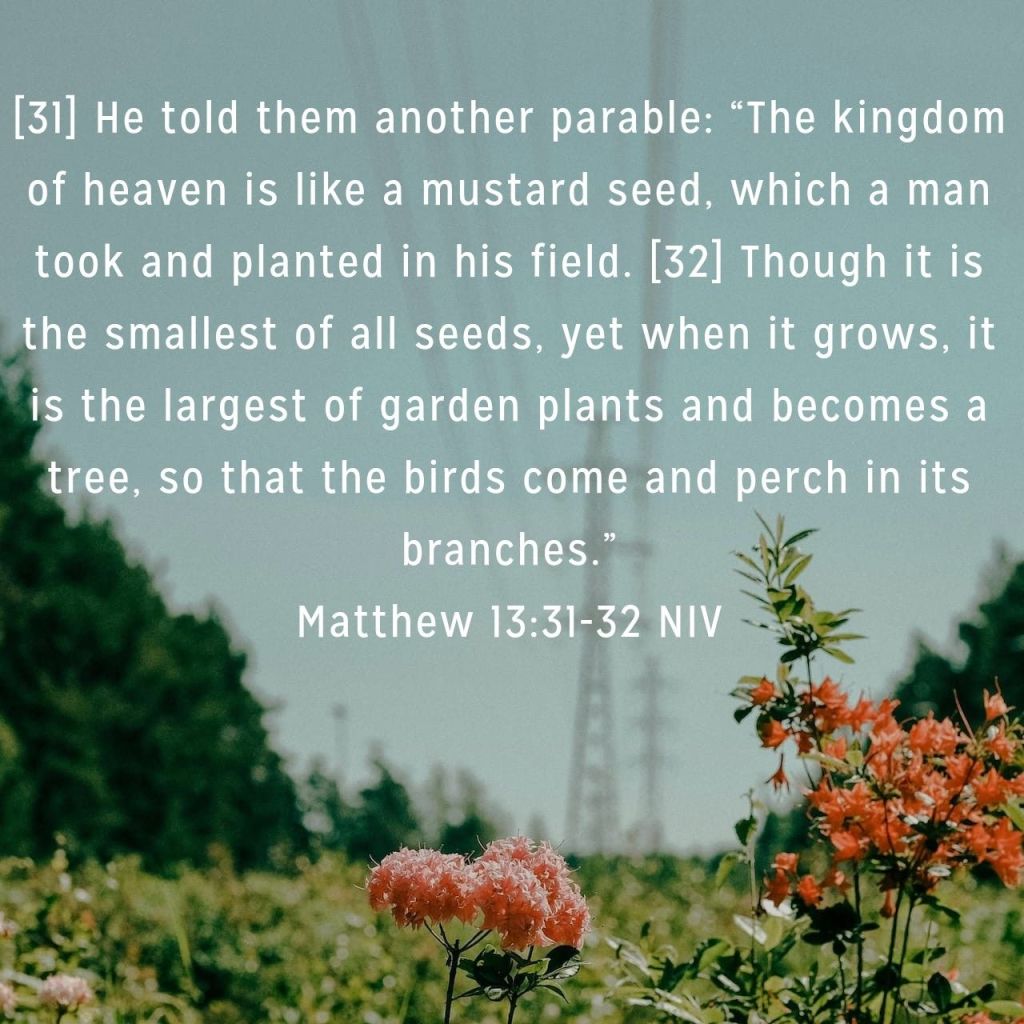I have always heard, through sermons and Bible studies, the mustard seed compared to faith in terms of Luke 17:5-6. “The apostles said to the Lord, ‘Increase our faith!’ He replied, ‘If you have faith as small as a mustard seed, you can say to this mulberry tree, ‘Be uprooted and planted in the sea,’ and it will obey you'” (NIV). Imagine having the faith to make something happen just by saying it, but using this seed as an analogy for power isn’t all Jesus had to say about the mustard seed.