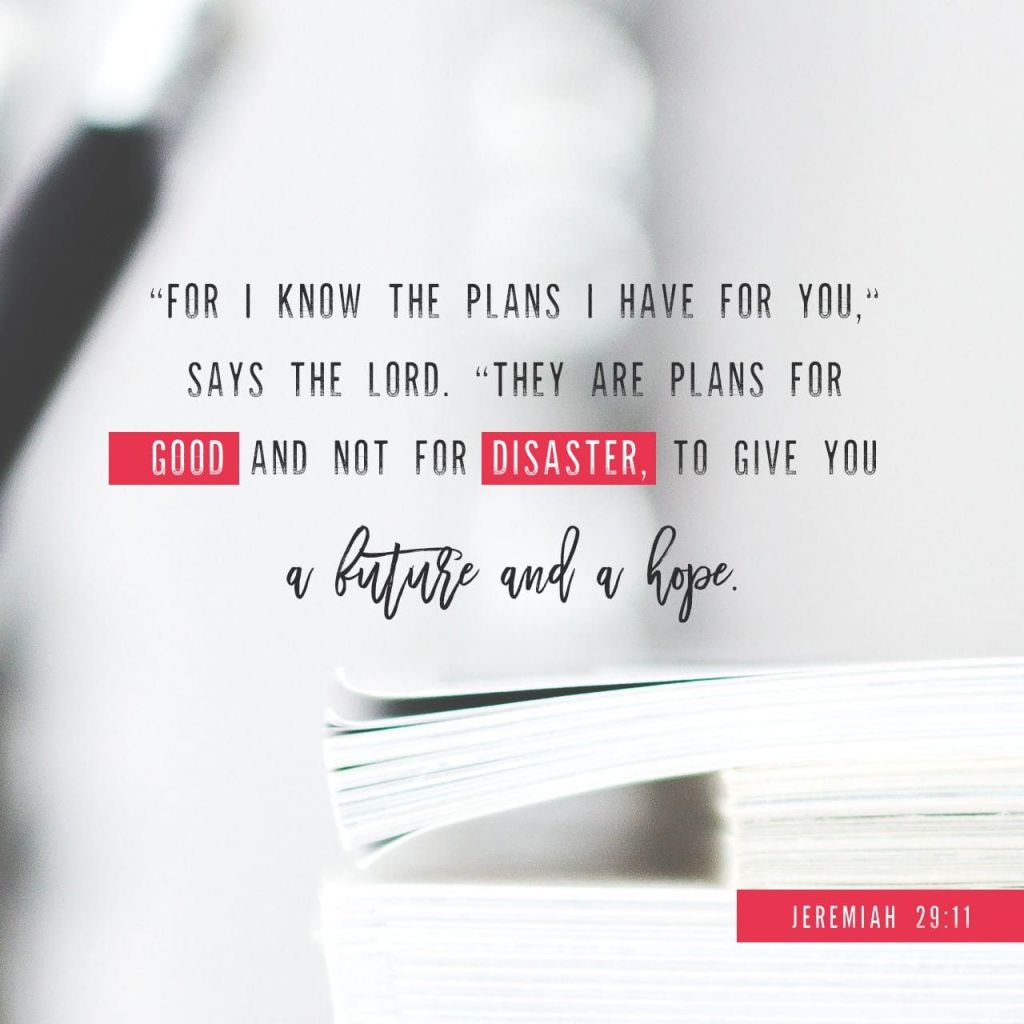 The prophet Jeremiah said in chapter 29 verse 11, “‘For I know the plans I have for you,’ declares the Lord, ‘plans to prosper you and not to harm you, plans to give you hope and a future.'”